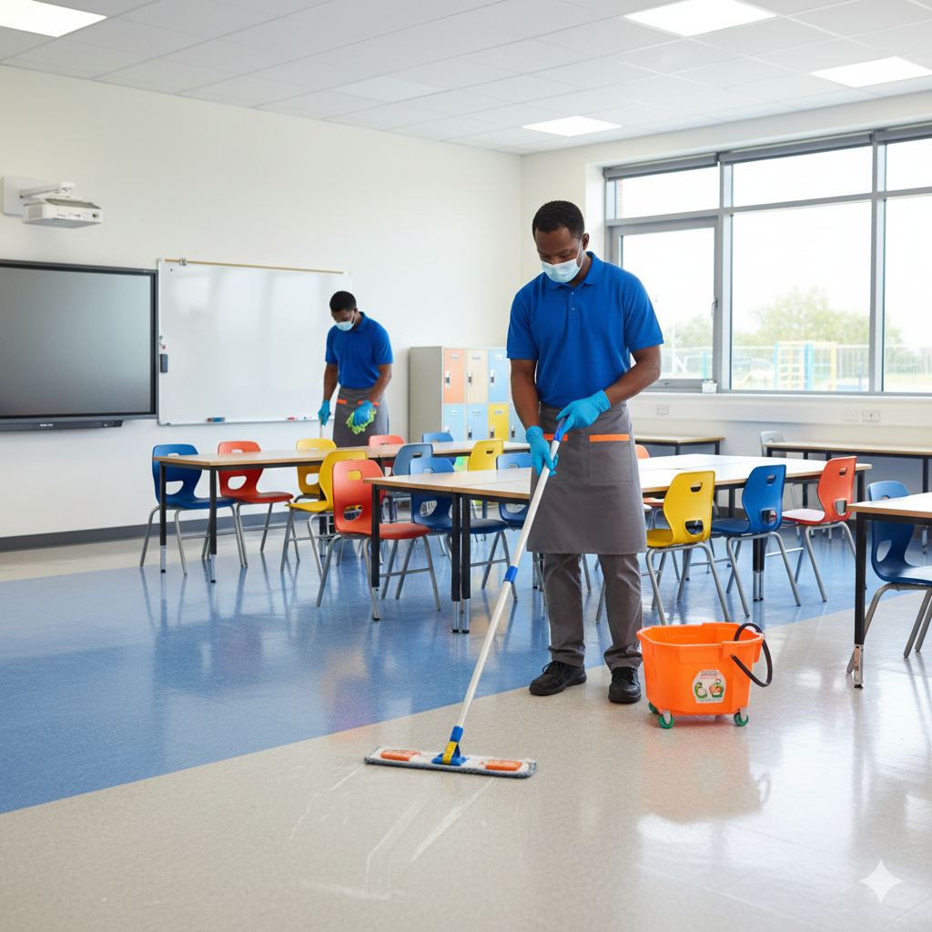 Clean surfaces, sanitized desks, disinfected restrooms, and polished floors.